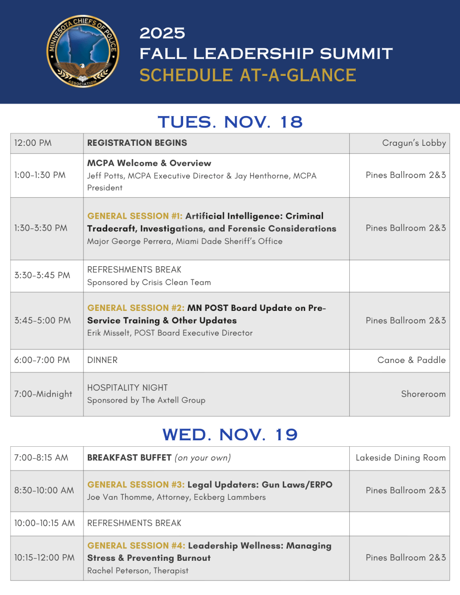 The Fall Leadership Summit is a 2.5-day training event designed specifically for Minnesota’s law enforcement leaders. Held at the scenic Cragun’s Resort, this conference offers high-impact leadership development, inspiring keynote speakers, and meaningful networking in a smaller, more collaborative setting.