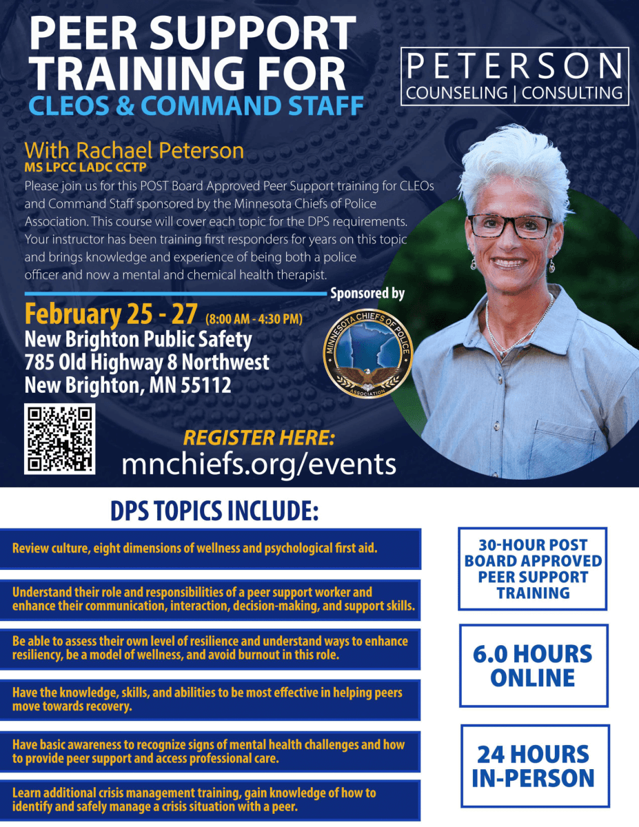 - POST Credit: Approved for 30 CEUs (in-person) and compliant with Minnesota Statute §181.9731 (Public Safety Peer Counseling)