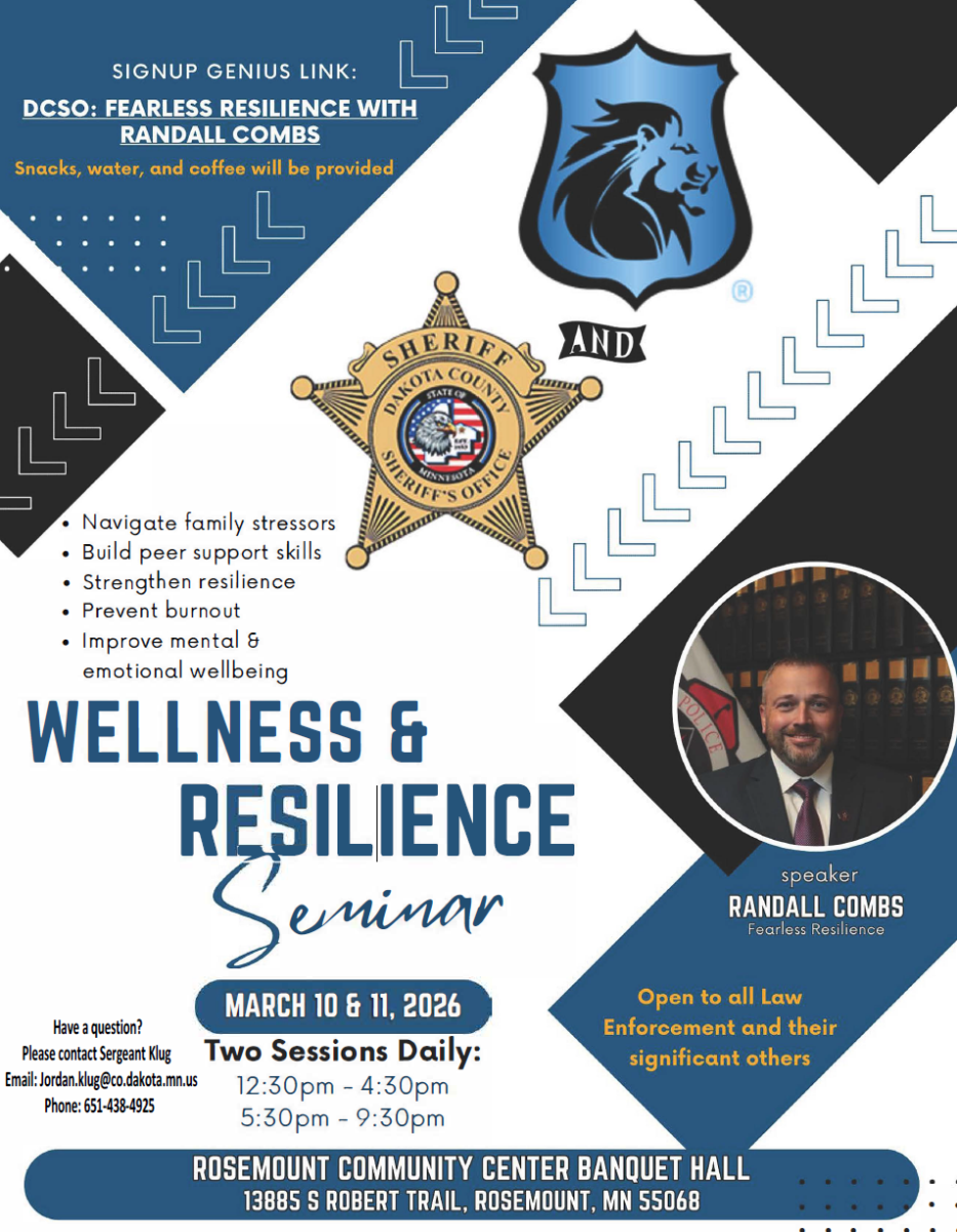 The Dakota County Sheriff’s Office Wellness Program is hosting a two-day Wellness and Resilience Seminar in March and is inviting neighboring public safety personnel and their significant others to attend.